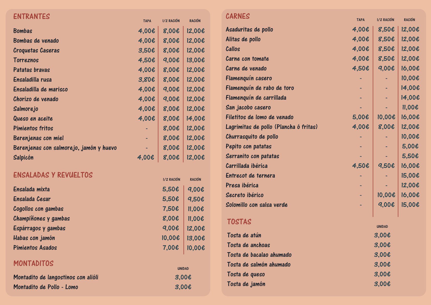 Especialidad en carne de venado, bombas, croquetas caseras, mejillones rellenos, callos...